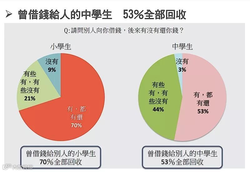 当孩子是小学生年纪时,他们比较单纯,借钱给别人的金额低,也比较容易要回借出去的钱,“有借有还(信任你而借钱)”这件事在他们心中很重要。但中学生为何只有53%的人能还钱,他们不在乎“信任”吗?
