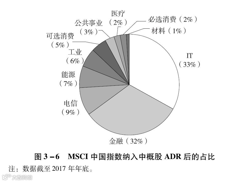 自1993年以来,中国公司陆续通过ADR登陆美国股市。其中,耳熟能详的中国公司有(BABA)、百度(BIDU)、网易(NTES)、携程(CTRP)等。截至2017年,在美国两大交易所(纽交所和纳斯达克纳斯达克证券交易所的简称。)上市交易的中国公司共有89家,主要集中在信息技术(32家)、可选消费(22家)、金融(12家)等行业。从市值角度来看,89只ADR的流通市值合计14万亿美元,占比排前三位的是信息技术(44.1%)、能源(21.2%)和电信服务(18%)。具体见表3-1。