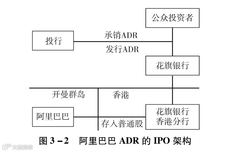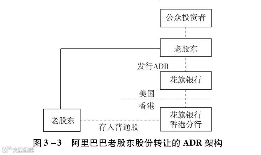 上市之前的股东也可将持有的股份转为美国存托凭证(American Depositary Receipt,简称“ADR”)后在美国证券市场流通。老股东将普通股存进托管机构花旗银行香港分行,而后存托机构花旗银行将这部分普通股转化为ADR。这样一来,老股东也能将ADR卖给美国投资者,从而达到变现的目的。持有ADR的投资者实际上是存托机构花旗银行的股东,他们拥有普通股的分红权利,也可间接获得投票权,投票权方式一般由存托机构确定。当然,投资者也可以向存托机构申请,将ADR转换为普通股后转回,只是这一过程需缴纳一定的费用。因为ADR的购买者不是的股东,所以他们很可能面临无法分配普通股股利和无法实现与普通股自由转换的。ADR的IPO架构及老股东股份转让的ADR架构如图3-2、图3-3所示。