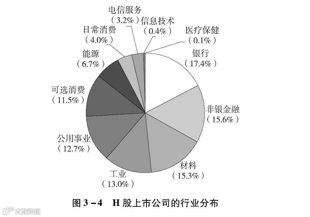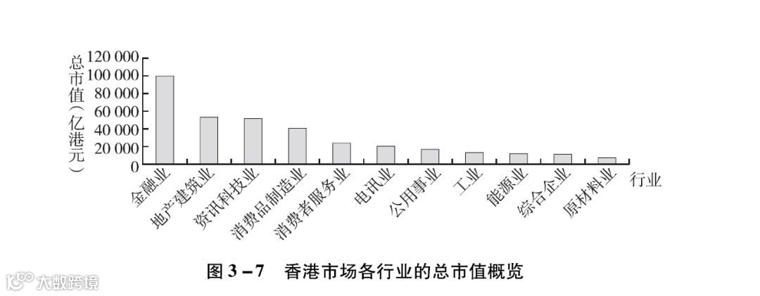 作为亚洲主要的上市交易场所,香港聚集着来自不同国家和地区,与亚洲有业务联系的公司。香港之所以能一直位居IPO市场的前列,依赖于其健全的司法制度、标准和惯例,以及机构投资者和散户的活跃参与。香港是内地与资本市场的主要连接,在内地经济发展中扮演着重要角色。20多年前的香港,成功推出H股上市机制,为内地一批进行股份制改革的国企提供了上市机会,也使香港成长为金融中心。目前,香港面临的一大挑战是,已上市公司中处于低增长行业的公司数量占比过高,影响了市场的活力,如图3-4所示。