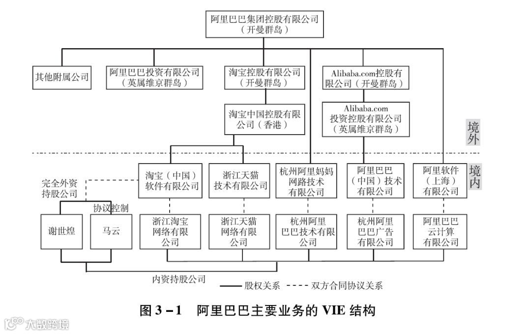 首先是关于中概股的VIE(可变利益实体)结构。的上市主体是在开曼群岛注册的集团控股有限公司,在境内设立各子公司[如(中国)软件有限公司和浙江技术有限公司],这些子公司通过协议控制着各经营实体(如浙江网络有限公司和浙江网络有限公司),这些经营实体均是由马云和谢世煌持股的内资公司。主要业务的VIE结构如图3-1所示。
