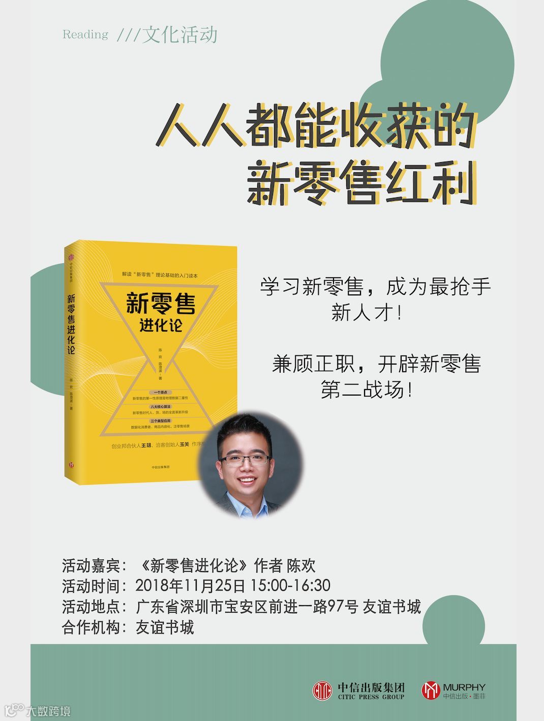 以上所探讨的以社区团购为代表的新零售模式,那新零售对普通的老百姓有何益处,11月25日,深圳友谊书城,听听《新零售进化论》作者陈欢怎么说!
