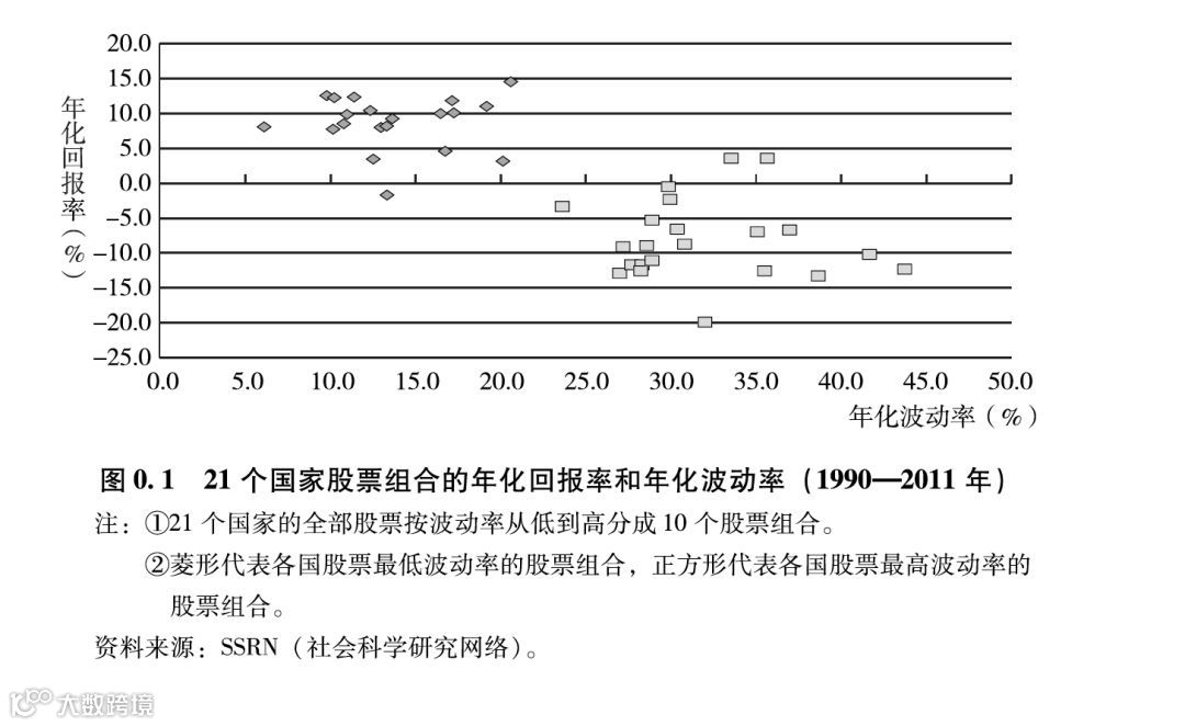到了1975年,一位叫作罗伯特·豪根(Robert Haugen)的金融学教授发现最低波动率/风险的股票的回报竟然要比最高波动率/风险的股票还要高。豪根教授后来还发现,这个现象不仅在美国股市存在,而且在其他 20 个国家的股市都存在,如图 0. 1 所示。虽然豪根教授为此不断呼吁重新看待资本资产定价模型,并称他发现的 “低波动率 之谜” 为金融研究最大的难题,但因为这个发现明显地违反了几乎所有入的直觉,当时的学者选择了对这一异常现象进行忽视。