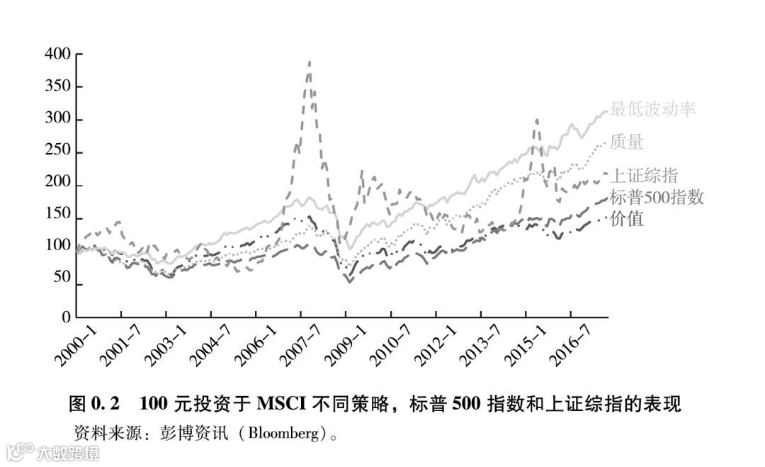 我在2008 年加入香港大学金融系,连续 7 年教授投资学” 、行为金融学、 基金管理和另类投资” 这些课程时,都向学生推荐了几个很简单的投资策略,比如买入与美国股市指数挂钩的基金并且长期持有;运用研究新发现的最低波动率策略, 也就“是买入最低波动率的股票组成的基金,或者运用其他一些 异常现象” 对应的策略,比如买入短期内表现好的股票、买入质最高的股票。如果自己操作则需要按照一定的规则定期调仓,如果买入这些策略对应的基金则只需要长期待有(调仓的工作由基金经理进行)。我向学生强调这些策略的长期表现要优千挑选个股和择时交易的传统投资膜式。图 0.2 是2000 年 1 月至 2017年9月这几个策略的表现,相信大家会十分惊讶表现显好的是显低波动率策略。