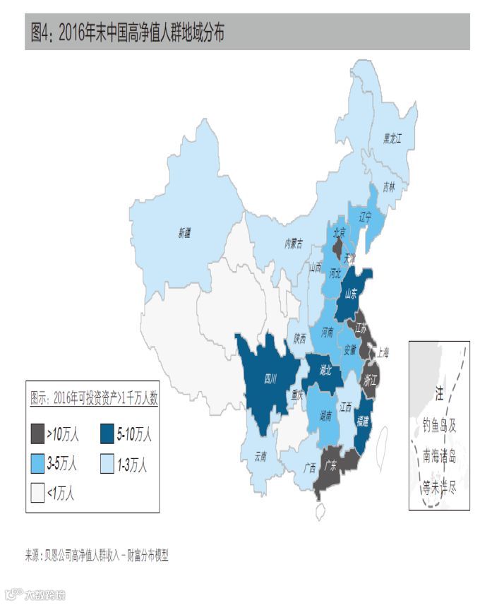 2006年—2017年的十二年间,中国财富管理市场发展非常快。到2017年,可投资资产总规模已经达到180多万亿元人民币。而从区域分布来看,财富群体主要集中在沿海和发达地区,比如北京、长三角、珠三角等。