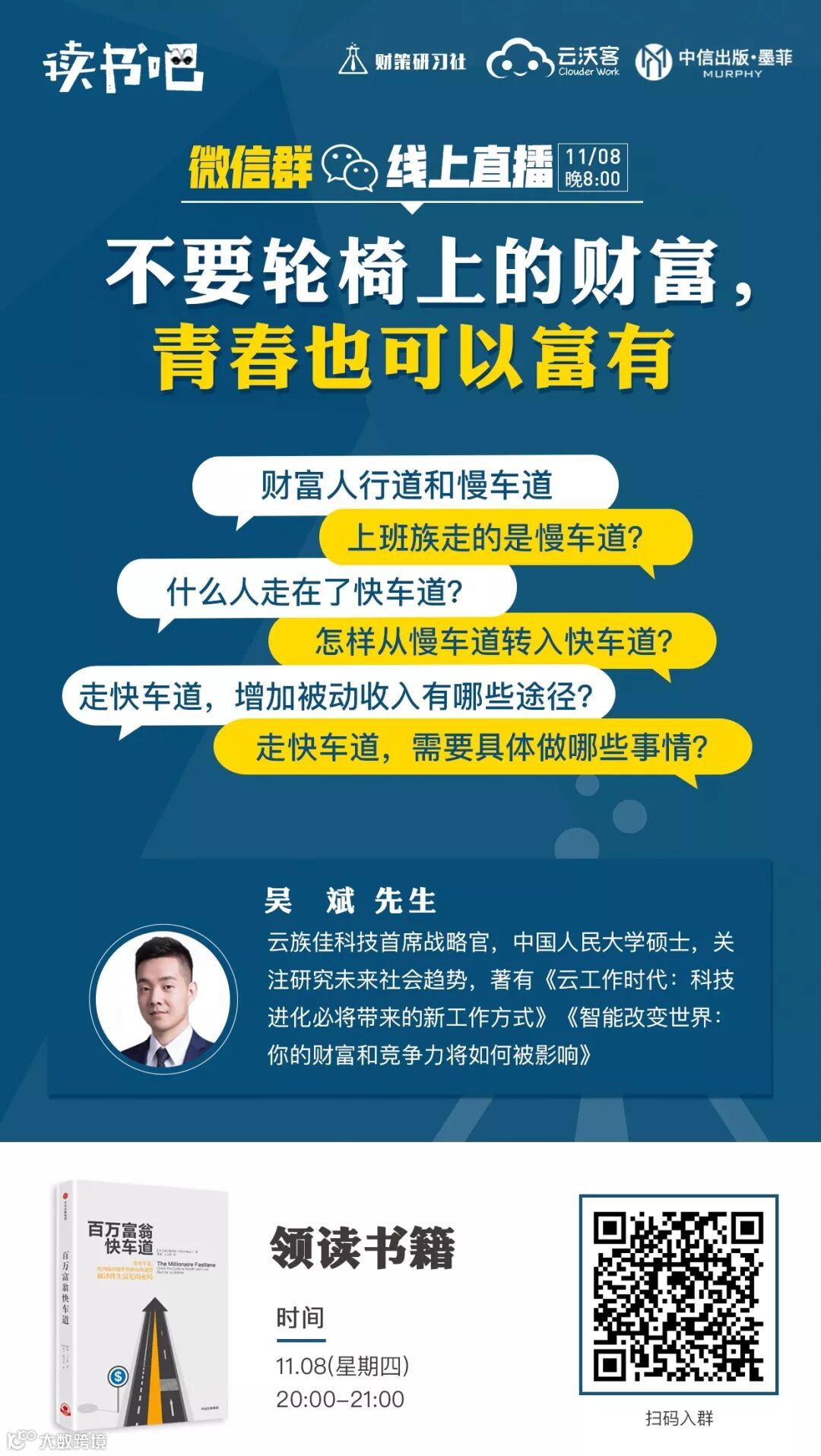 为此,中信出版集团墨菲图书工作室联合财策研习社邀请吴斌老师在线为大家分享“不要轮椅上的财富,青春也可以富有”。