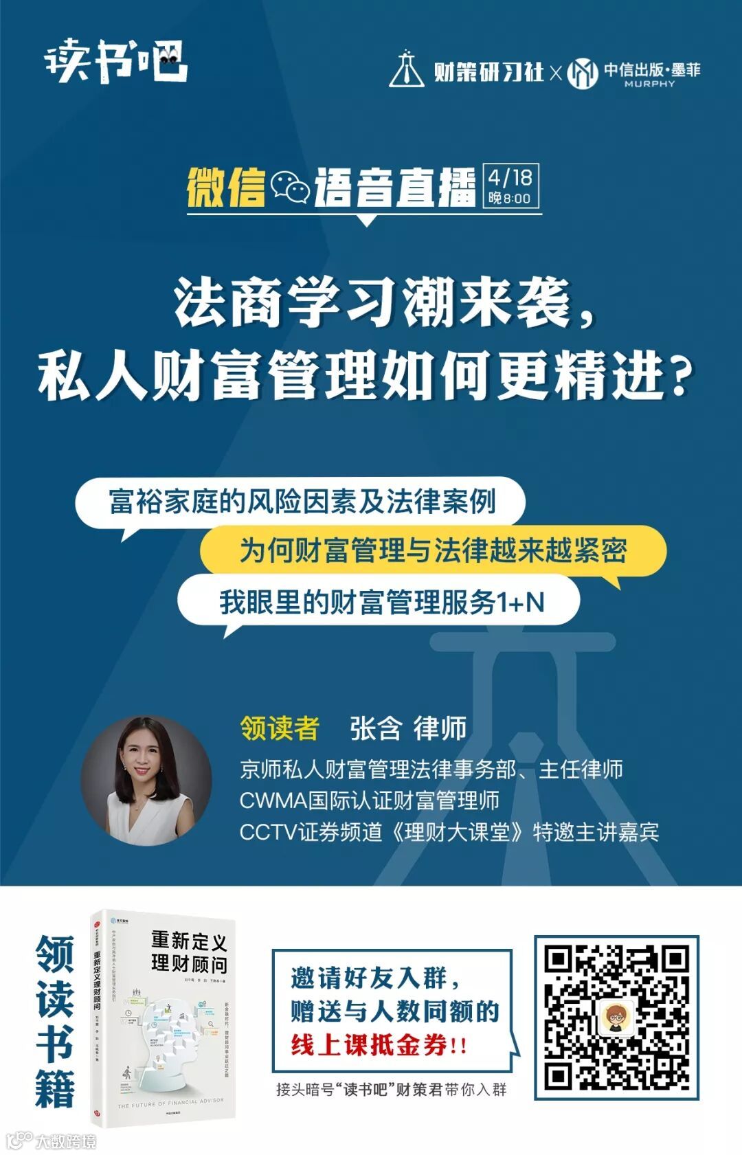 4月18日,中信出版·墨菲*财策研习社特别邀请张含律师,带领大家研读《重新定义理财顾问》,从一位专业财富管理律师的视角探讨新金融时代,理财顾问的职业定位与发展。