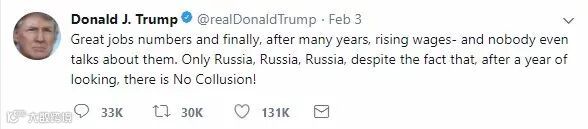 1月的数据非常棒,在多年之后,薪资终于上扬,但居然没人谈论这件事。(大家谈论的)只有俄罗斯,俄罗斯,俄罗斯,尽管事实上,经过一年的调查,根本不存在勾结!