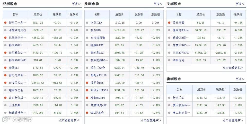 而全球股市迅即遭遇了两年内最大血洗,哀嚎声一片。恒指收盘跌逾5%,恒生国企指数跌逾6%。而日经225跌幅更是扩大至5.05%。台湾加权指数跌幅也扩大至5.3%,创2015年8月24日以来最大跌幅。