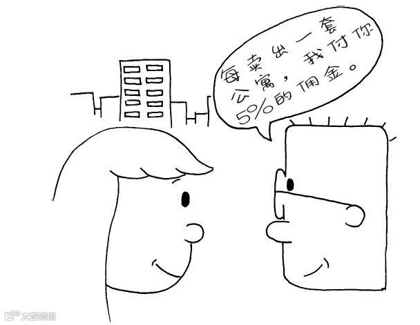 比如说,你受雇销售一个高层建筑里所有的公寓,开发商把全年你卖掉的公寓总价值的5%付给你。