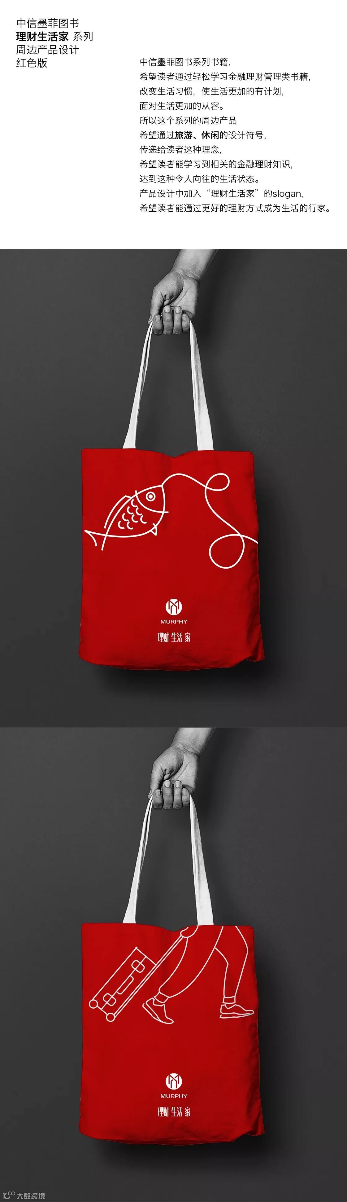 饱满的红色,象征着吉祥如意,白色的线条勾勒出灵动的鱼,带着鱼出发,带出好生活。