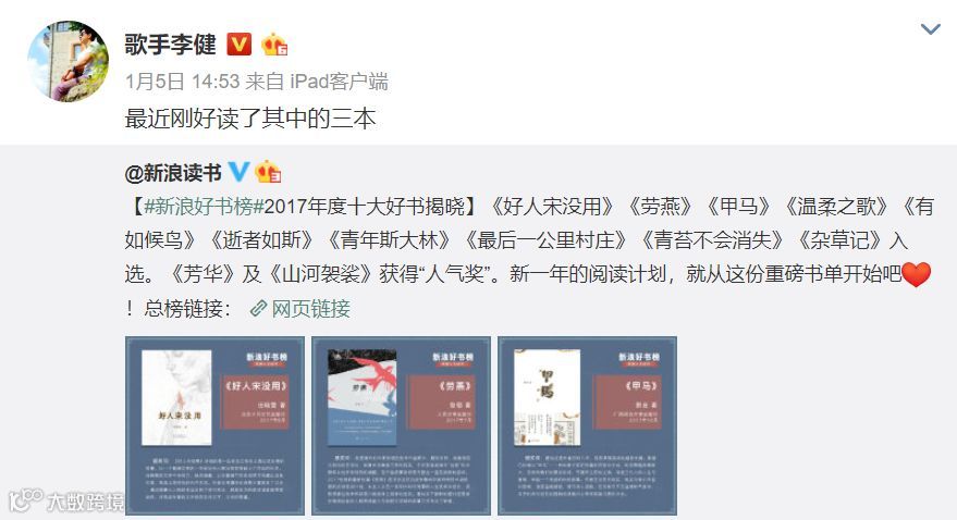 这么丰富的阅读,大概能部分解释李健特立独行的作风,因为他一直都知道自己想要什么,并且为重要的东西付出时间和精力。爱生活、爱阅读本身就蕴含着高级的快乐!