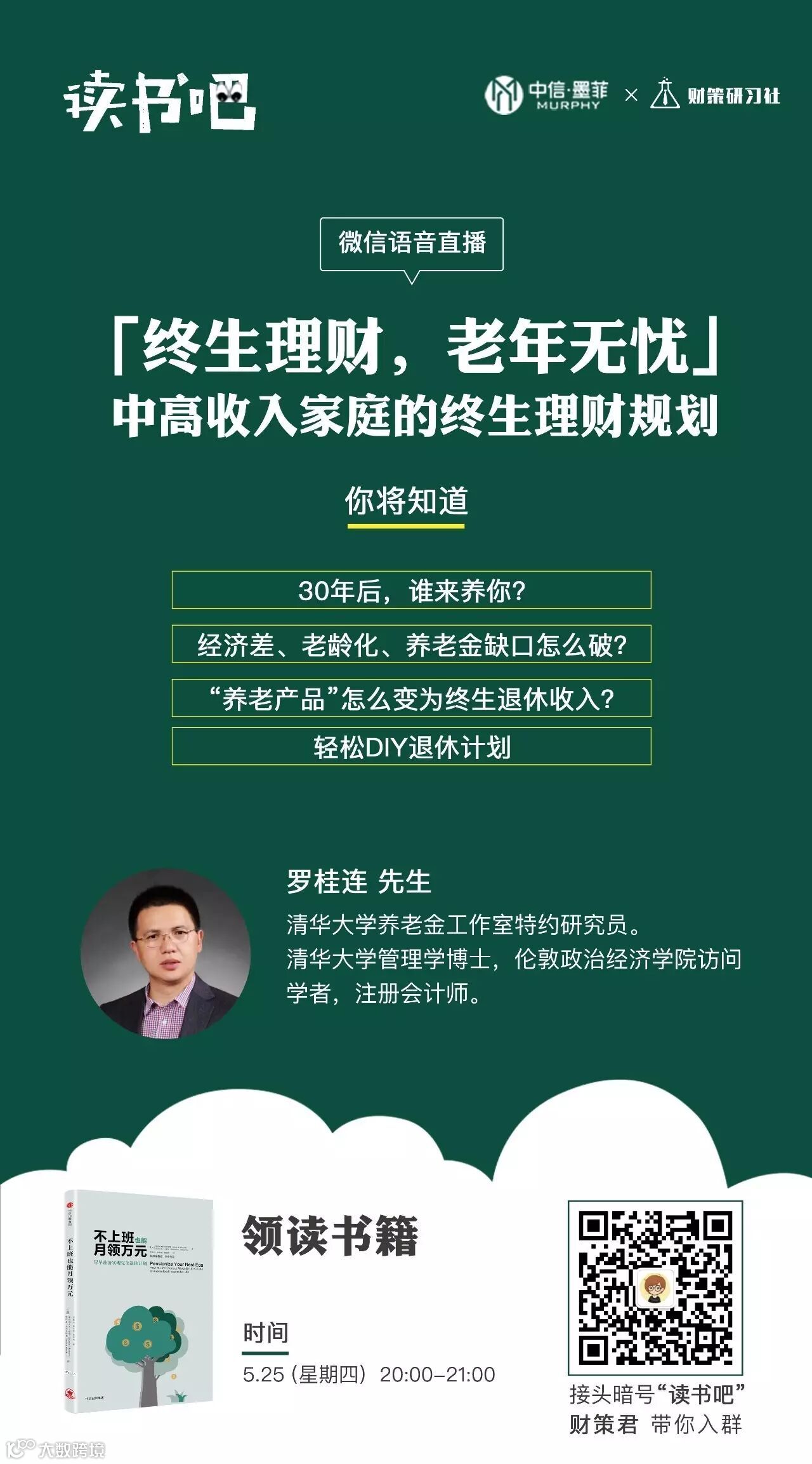 在北京时间 5 月25日(周四)晚 8 点,清华大学养老基金工作室特约研究员罗桂连老师做客墨菲读书会,为大家就养老问题答疑解惑!