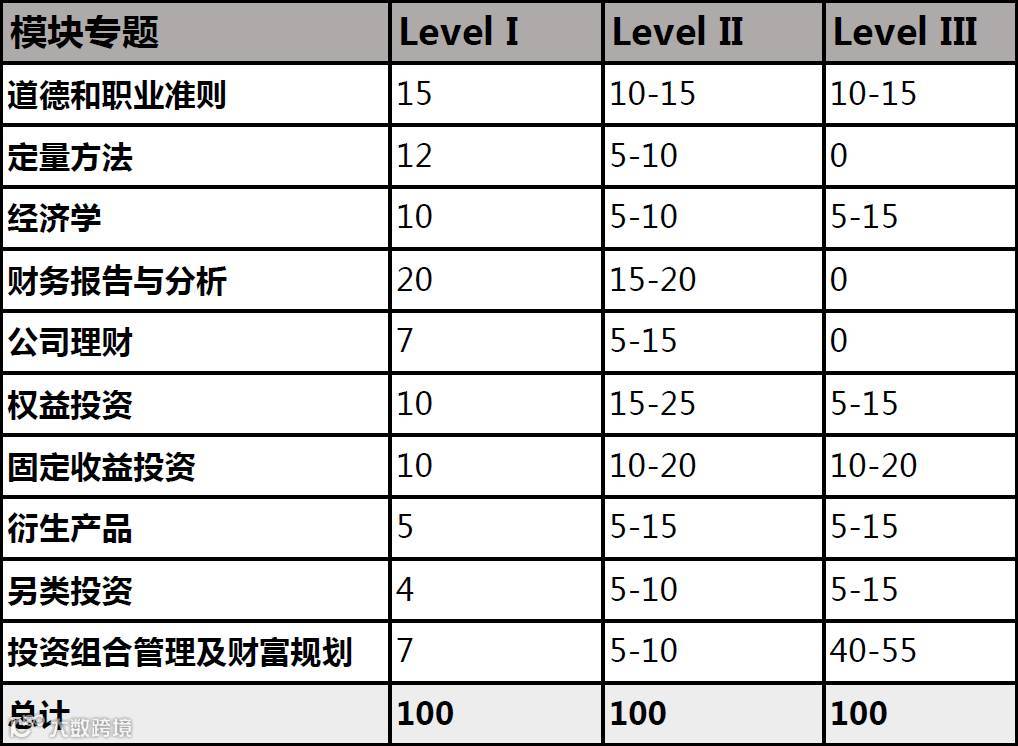 CFA考试共分为Level I、Level II、Level III三个级别,通过了Level I考试才能参加Level II考试,通过了Level II考试才能参加Level III考试。每个级别考试时间均为6小时,上午和下午各3小时。具体模块及其权重分布如下表所示: