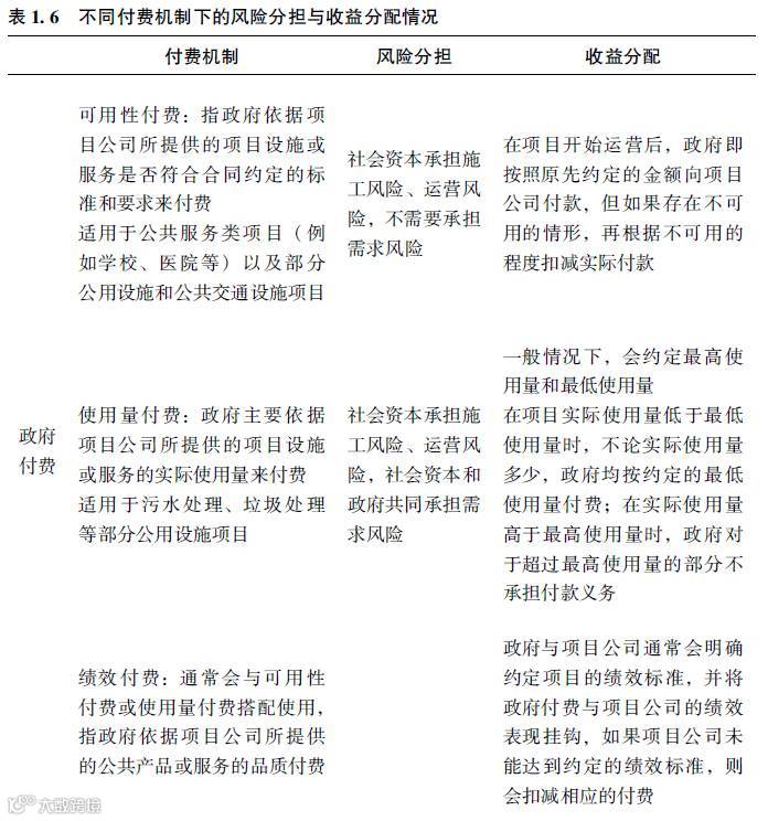 根据财政部《PPP项目合同指南》,常见的付费机制主要包括政府付费、使用者付费和可行性缺口补助3种,不同的付费机制大体反映了不同的市场风险分担情况以及对应的收益分配情况。详见表1.6。