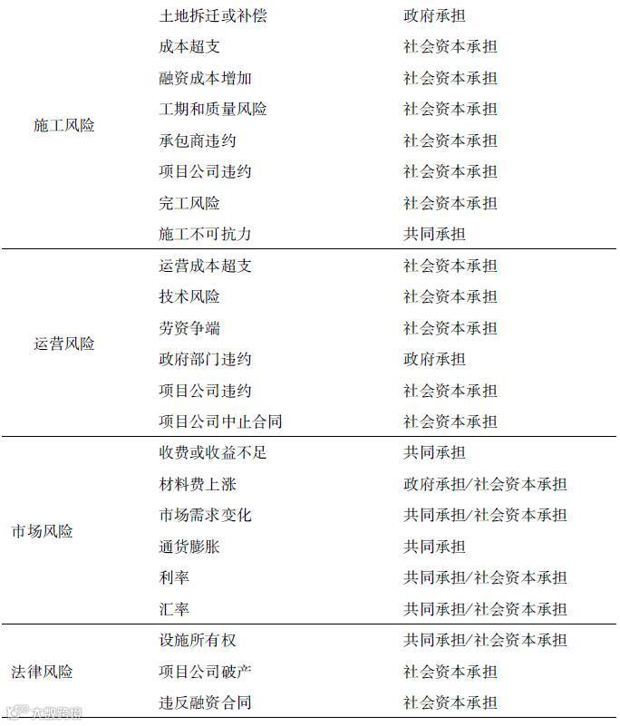 一般而言,社会资本主要承担项目的融资、建设、采购、经营和维护风险,当然,项目公司也会把有关风险再转移到承包商、供应商、运营商、银行和保险公司等;政府主要承担法律、规划、汇率等风险。