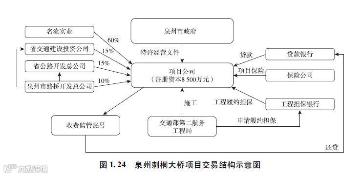1994年年初,泉州市决定修建一座跨江大桥(刺桐大桥),由于政府财力有限,因而对外招商,最终泉州市名流实业股份有限公司(民营内资企业,简称“名流实业”)中标,牵头组建项目公司,以BOT模式进行大桥的建设运营。项目公司的特许经营期为30年(含建设期),期满后将全部设施无偿移交给泉州市政府。项目的交易结构如图1.24所示。