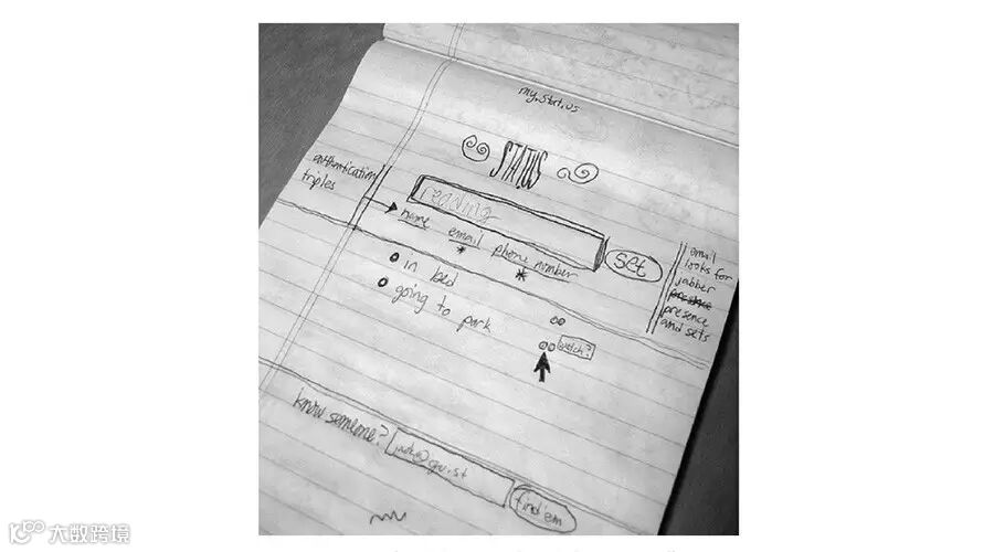 在奥迪奥有一名杰出的网站设计师杰克·多尔西(Jack Dorsey),他也是推特的创始人之一。小时候我们会对很多很多东西着迷,有的人会对乐器情有独钟,有的人则对小汽车痴迷,然而,对小多尔西来说,从小到大一直吸引着他的是“城市”。由于从小对城市以及城市的运作充满好奇,还在上中学的小多尔西就开始自学计算机编程。你或许会问:编程和城市怎么能扯上关系?在每次演讲中,多尔西都会解释道:“通过学习计算机编程,我能够将城市地图呈现于电脑屏幕,并对其进行不同的改变和设置,从而模拟出城市系统的运作情况。”然而,在了解了城市运作系统后,多尔西那颗大大的好奇心仍未被填满。城市电网和公共交通等系统能够自动汇报即时的运作情况,人们通过收集此类信息就可以了解城市状况。但是组成城市的另一不可忽略的部分——人——却没有被包括进来。人们难以向外界实时更新自己的信息,告诉别人“我在哪里”以及“这里正在发生着什么”。同样,他们也接收不到自己所关心的人的实时情况。所以早在加入奥迪奥之前,多尔西就用纸笔画出了草图(图1),画的是一个可以随时更新自己状态并让好友即时接收到的应用,这一应用就是后来大名鼎鼎的推特的雏形。