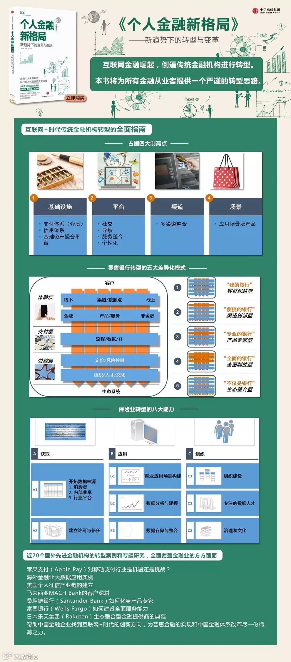 《个人金融新格局》一书是一本全面的金融机构转型指南,笔者所在的商业银行转型只是该书的一个切面,券商、保险公司和其他新兴业态公司都能从书中获益良多。这本书不但提供了翔实的数据分析和国外同行的先进经验,我认为它承载的系统性的思维方式和转型思路更为可贵。