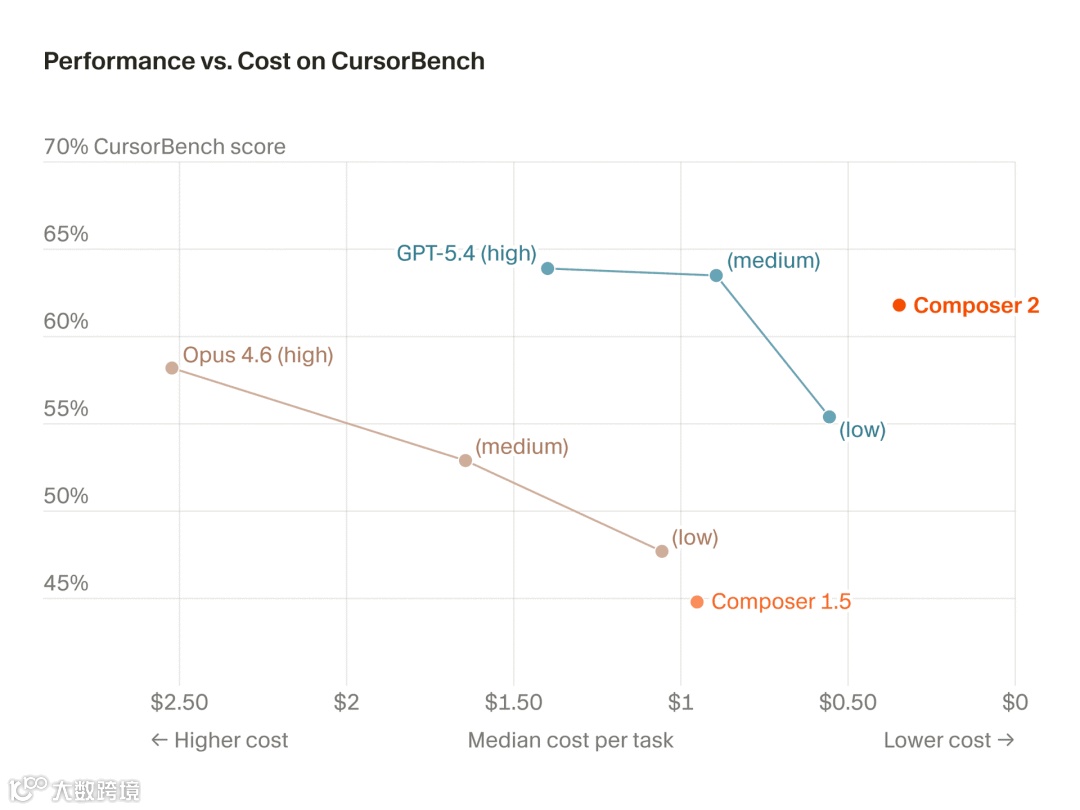 Cursor发布Composer 2及Fast版本,该模型拥有20万Token上下文,专为复杂编程任务优化,标准版百万Token输入/输出价格为0.5/2.5美元,相比前代降幅高达86%。