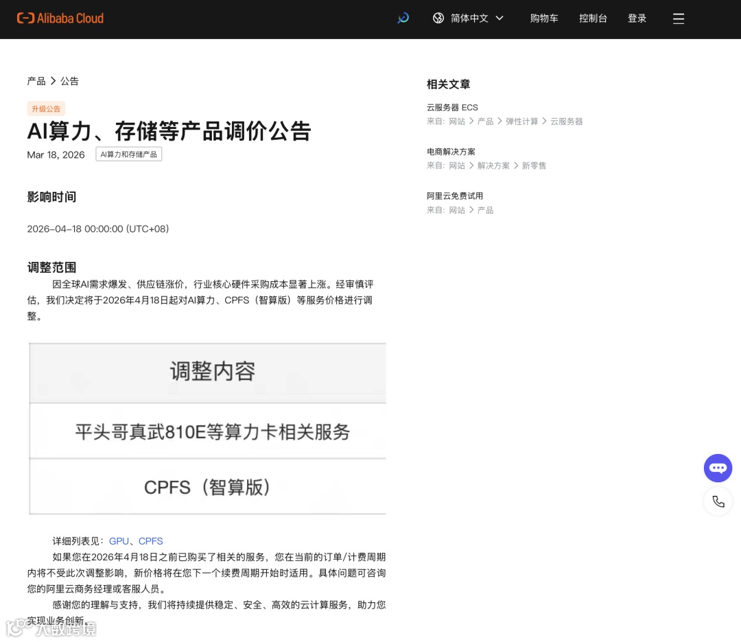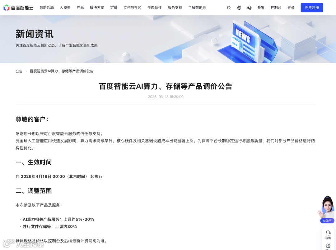 阿里云与百度智能云同步发布公告,宣布因全球AI需求爆发、供应链成本上涨及核心硬件采购成本增加,将于4月18日起对AI算力及存储产品进行价格上调。