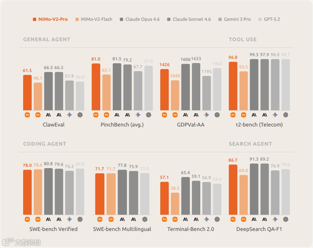 旗舰模型MiMo-V2-Pro采用总参数超1万亿、激活参数420亿的MoE架构,支持百万上下文,在Artificial Analysis综合排行榜位列全球第八,并在PinchBench以84.0分达到全球前三。