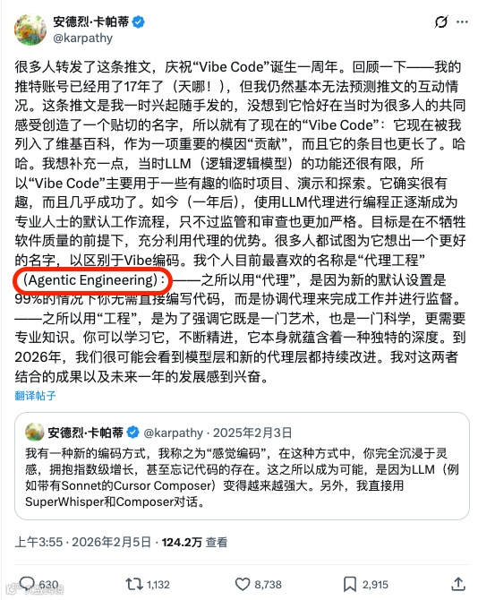 他甚至说vibe coding已经过时了,新的说法叫"agentic engineering":99%的时间你不碰代码,你在编排agent,充当监督者。