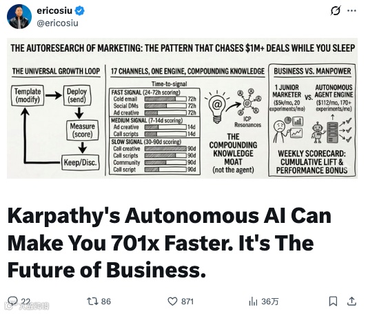 广告公司Single Grain的创始人Eric Siu提出了一个数字:传统营销团队一年做20-30次实验就算"数据驱动"了。用autoresearch的逻辑,下一代团队一年可以跑36500次——每天100次,在你睡觉的时候完成。做法是把训练脚本换成着陆页或广告文案,把评估指标换成转化率,agent改变量、测试、保留或回滚,然后循环。他推文的原话说:“Karpathy 的自主人工智能可使您的工作效率提升 701 倍。这是商业的未来。”
