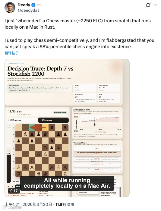 他自己的感慨是:我以前半竞技地下过棋,没想到现在你可以直接用嘴"说"出一个98百分位水平的国际象棋引擎。完全由AI完成。