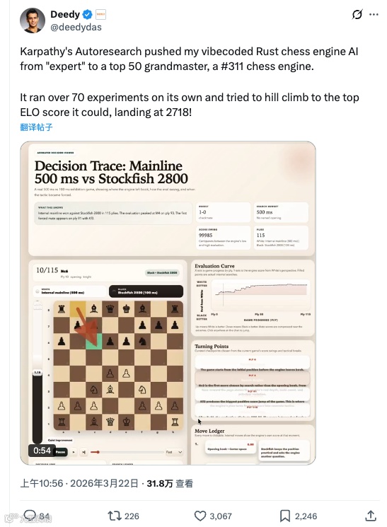两天后的3月22日,他又发了一条:同一个引擎,他套用了一个叫"Autoresearch"的方法,让AI agent自己去优化这个引擎——自动改搜索算法、调评估函数、优化参数。70多轮实验之后,ELO从2250直接拉到了2718,世界排名第311位,跻身前50名特级大师的水平。