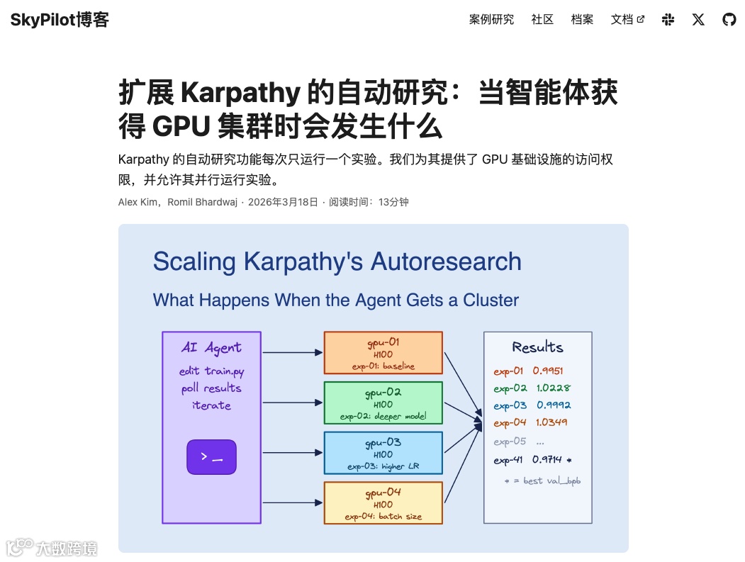 SkyPilot团队给agent接了16块GPU,8小时提交了910次实验。并行化让agent不再只能"一步步爬山",而是能一次测试多个变量的组合效果,一轮完成原来需要六轮才能做完的工作。