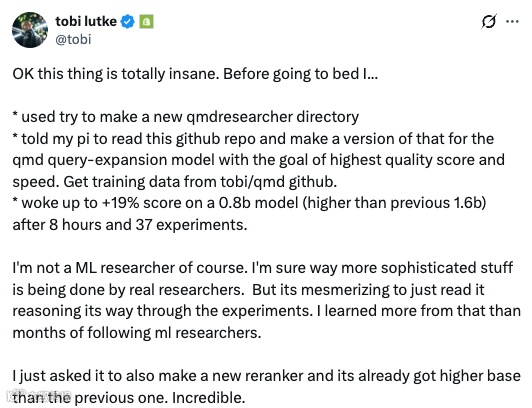 著名网络购物平台Shopify的CEO Tobi Lutke把autoresearch指向了一个内部查询扩展模型。一晚上37轮实验之后,一个0.8B参数的小模型在质量上超过了他之前手工调了很久的1.6B大模型。关键原因是:agent不会默认"越大越好",它针对具体硬件找到了最优的架构配置。