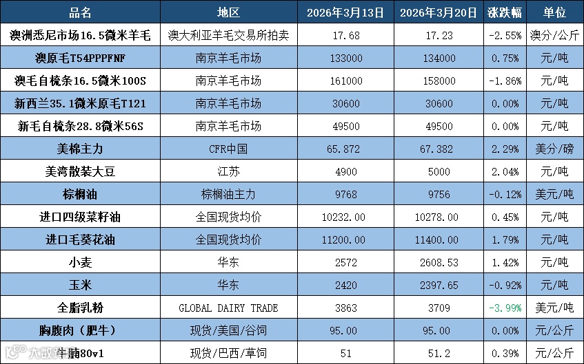 羊毛:继上周触及2019年6月以来的最高点后,澳大利亚羊毛市场未能延续其上涨势头,在本周拍卖中下跌。本周供应量42,278包,比前一周减少3,198包。从第一天开始,开盘即呈跌势,且全天持续下跌。由于悉尼和弗里曼特尔未跟随上周四墨尔本单独拍卖时小幅回落,因此本周跌幅较大。