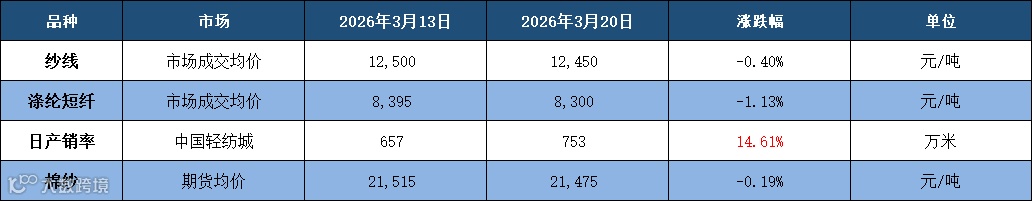 涤纶短纤:受中东地缘冲突推升原油大涨带动,PTA、乙二醇等聚酯原料同步暴涨,形成极强成本支撑,但下游纱厂担忧目前高价位原料做的成品后期面临贬值风险,追涨谨慎,刚需采购为主。涤纶短纤整体呈现成本强、供需弱的博弈格局,目前价格维持高位震荡,半光1.4D主流报8600-8700元/吨。预计在地缘冲突影响下,涤纶短纤短期内价格将继续维持高位。