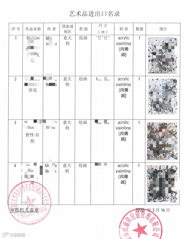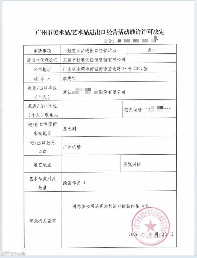 申请批文:货物发运前,向口岸所在省级文旅部门提交申请,材料通常包括申请企业营业执照、艺术品图录等。 -