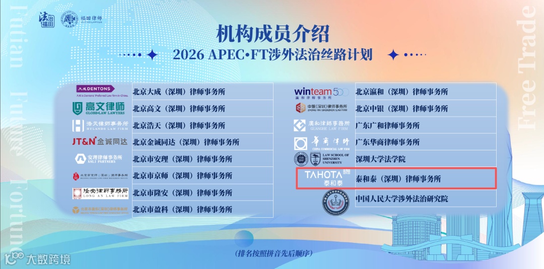 本次会议由深圳市福田区司法局指导、深圳市律师协会福田区律师工作委员会主办。会上,泰和泰(深圳)律师事务所凭借在涉外法律服务领域的专业积淀与突出贡献,正式获聘为丝路计划支持单位;我所泰出海跨境投融资与贸易研究院执行院长沈晓雪律师获聘为丝路计划机构成员。下一步,我所将以深厚的专业素养与实务经验,积极为2026年APEC会议贡献涉外法治专业力量。