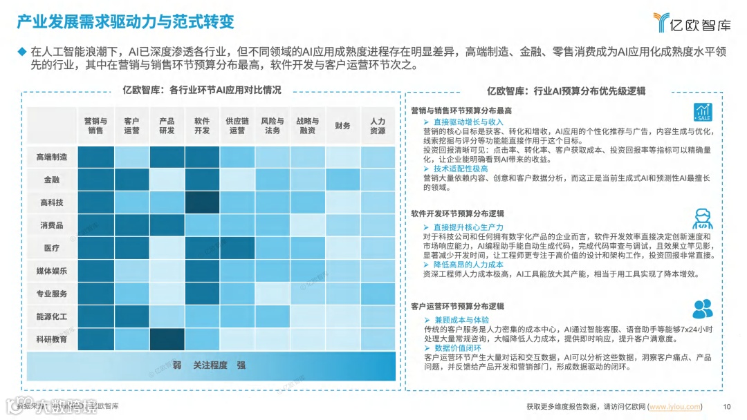 企业在AI预算方面花费最多的地方是“营销与销售”,排在其次的分别是“软件开发”以及“客户运营”。而其背后所蕴含的道理是非常简单的,点击率、转化率、获客成本这类指标是能够做到精确量化的,能够让企业清晰明白地看到由AI所带来的收益。