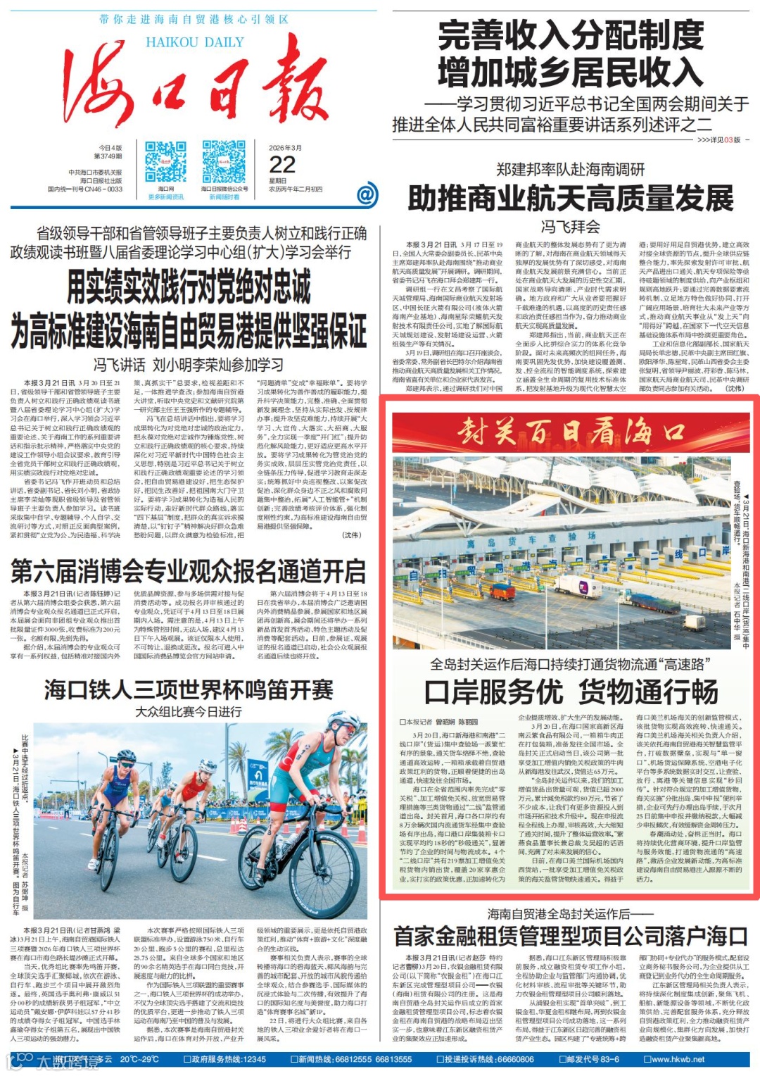 3月20日,海口新海港和南港货运“二线口岸”查验场货车川流不息,通关高效。货物正快速发往全国市场。