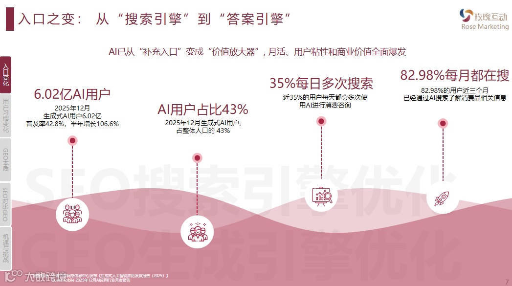 AI技术正重塑用户信息获取方式。过去用户需在搜索引擎列表筛选链接,如今通过AI对话框可直接获取精准答案。流量入口迁移要求营销逻辑同步进化——企业目标已从“让用户找到我”转向“让AI推荐我”,这是一场从入口思维到认知思维的战略升级。