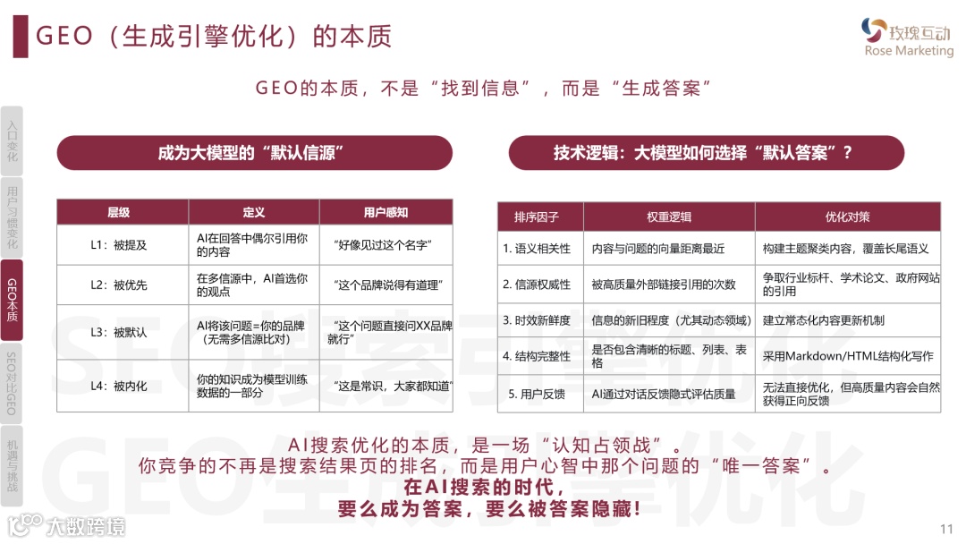 - GEO本质:使品牌成为AI生成答案时的“默认信源”