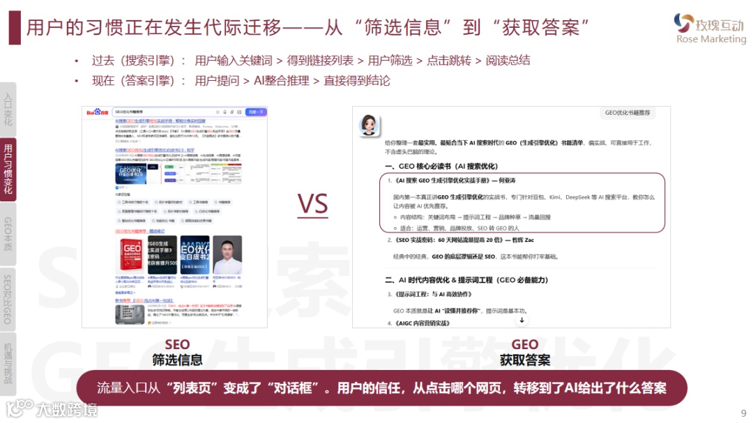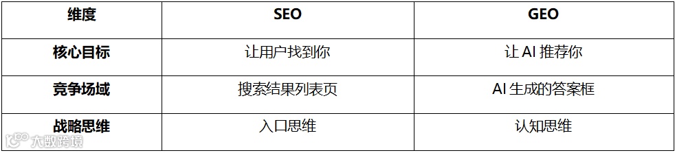 随着AI大模型成为流量分发新中枢,GEO的战略价值显著凸显,其与传统SEO存在本质差异: