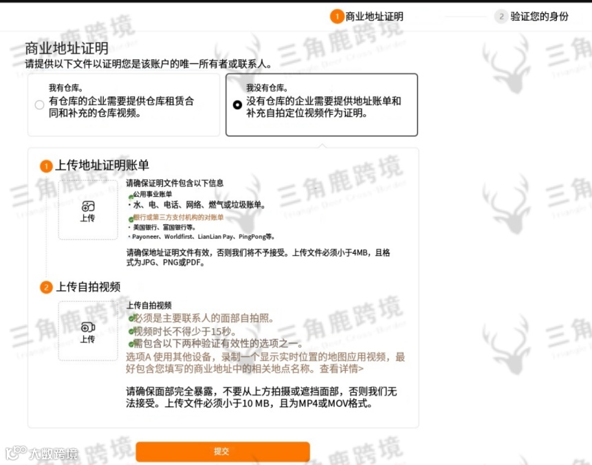 商业地址验证需同步提供:①水电/网络/燃气账单或金融机构对账单(4MB内JPG/PNG/PDF格式);②不少于15秒的真人定位视频。某服务商案例显示,首次因未开启实时定位遭拒,二次提交定位后方通过审核。