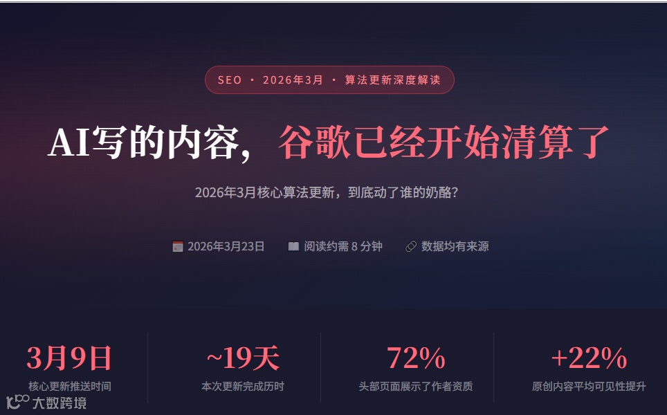2026年3月9日,谷歌发布首个年度广泛核心算法更新,历时19天完成。部分网站流量骤降,另有网站涨幅达22%。此次更新传递的信号远比流量波动更值得关注。