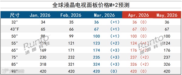 国际电子商情洛图科技最新报告显示,全球液晶电视面板已进入明确涨价周期。3月中小尺寸面板普遍上涨1美元,中大尺寸上涨2至3美元。4月55英寸以上大尺寸将继续上调,其中55英寸涨1美元,65、75、85英寸各涨2美元,涨幅略有收敛但仍保持上行态势。