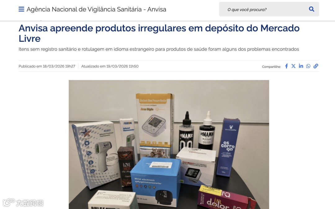 3月18日,巴西国家卫生监督局(Anvisa)突击检查圣保罗州卡雅马尔市美客多(Mercado Livre)物流中心,重点查处未注册医疗器械、化妆品及食品等违规产品,查获数千件违法商品并责令下架相关广告。