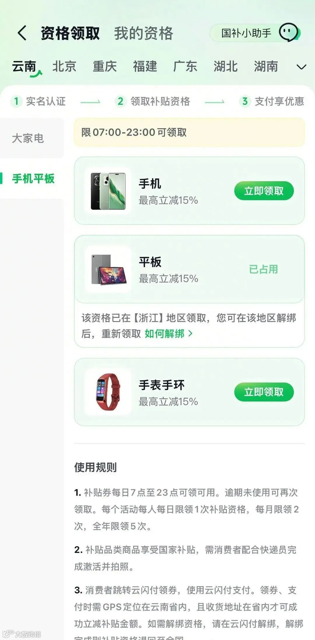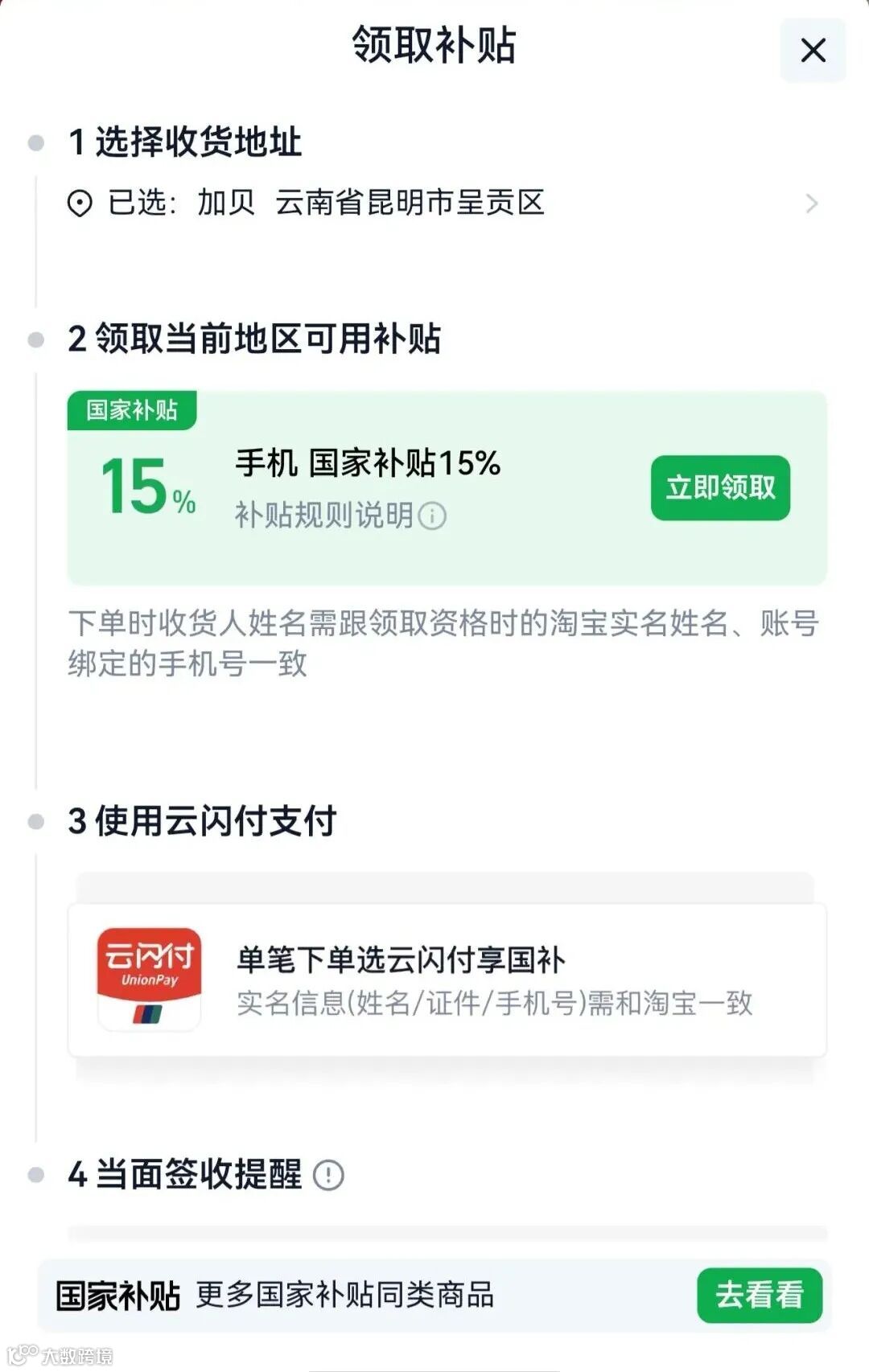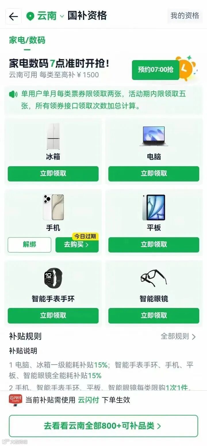淘宝天猫用户可打开App搜索"云南以旧换新"领取资格,或在标有国家补贴标识的商品详情页点击"立即领取"后下单使用。