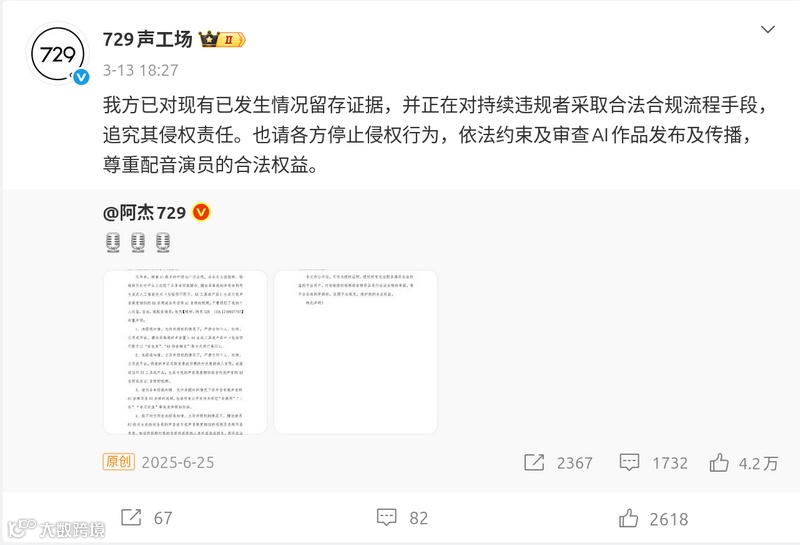 配音公司"奇响天外"(服务《原神》《王者荣耀》项目)及"729声工场"(《狐妖小红娘》《剑网3》)联合声明,严禁未经授权的AI声音数据训练与使用,违者将依法追责。