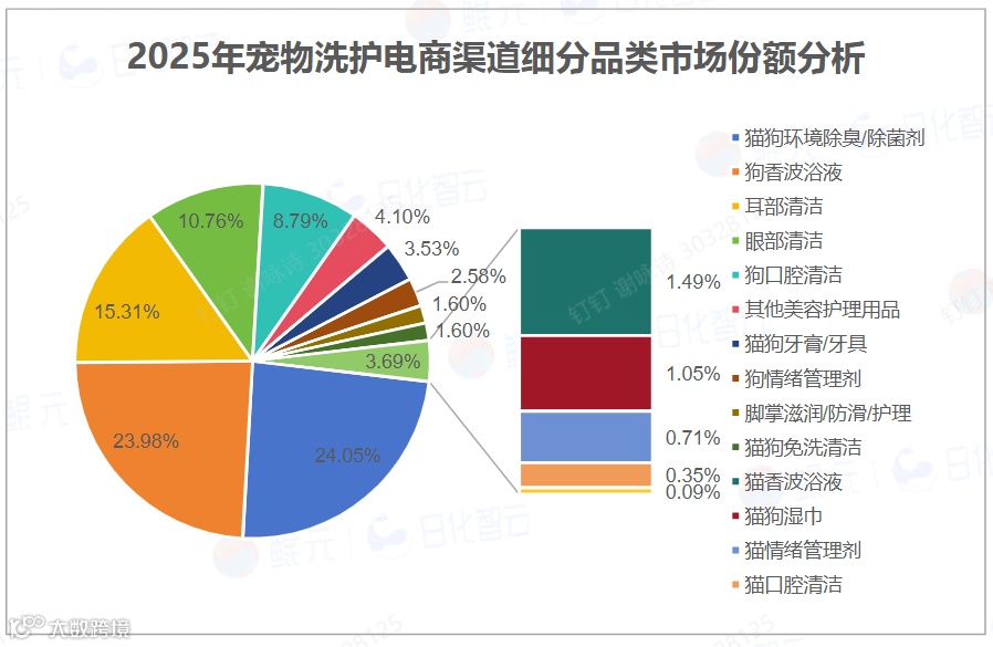 2025年猫狗环境除臭/除菌剂销售额5.33亿元(占比24.05%),同比增长24.58%。狗香波浴液5.31亿元但增速放缓(4.95%)。宠物餐具清洁剂同比激增556.5%,显示宠物家居清洁场景快速崛起。猫类增长更显著:猫香波浴液增速(26.27%)远超狗类,情绪管理剂(32.31%)及口腔清洁(29.4%)表现突出。