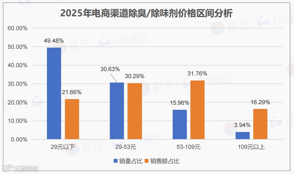 29元以下低价区销量占49.48%但销售额仅21.66%,竞争激烈;29-53元中低价区量价均衡;53-109元中高价区销量15.96%贡献31.76%销售额,溢价能力强;109元以上高价区属小众高端市场。