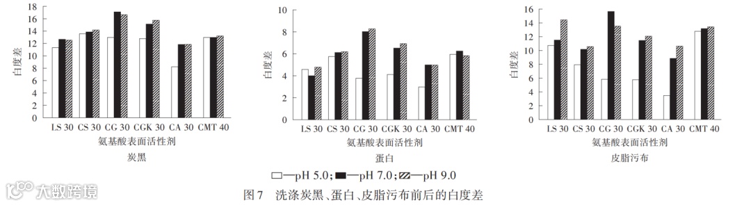 ③ CS 30对皮脂污布去污力略低于LS 30,但对炭黑、蛋白污布更强;